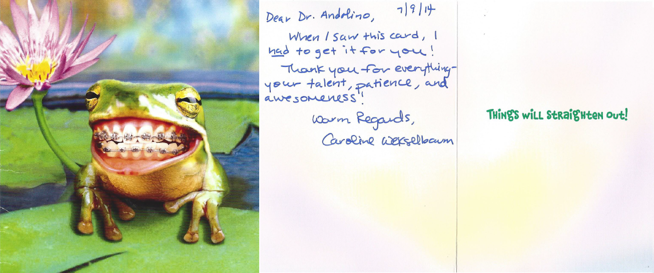 We received this ribbeting card from an Andolino Orthodontics patient and Dr. Andolino toad-ally loved it!