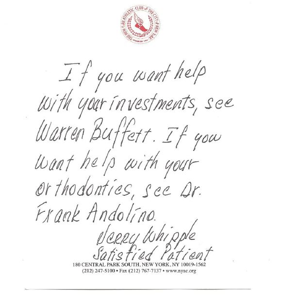 Dr. Andolino is a Talented and Caring Orthodontist![]() Notwithstanding that I wore braces as a child, when I moved to Manhattan nearly 40 years later, my new dentist told me if I didn't have braces my teeth would fall out! I was referred to Dr. Andolino's office and they were professional, kind and did an outstanding job on my teeth. I still have a wire on my lower teeth which doesn't show and more importantly, prevents my teeth from moving out of line. I also have a bruxism splint for TMJ which is fantastic and I can't sleep without it. Dr. Andolino is an extremely talented and dedicated orthodontist. In addition, he is actively involved in a program which provides free dental care to people in a third world country. He goes there to treat needy people as well as helps run the program through the government in that country. No punn intended, but he puts his money (and self) where his mouth is. I greatly appreciate and admire Dr. Andolino's talent as well as the fact that he cares and gives back to others. -Nancy A. 3/3/2012 |